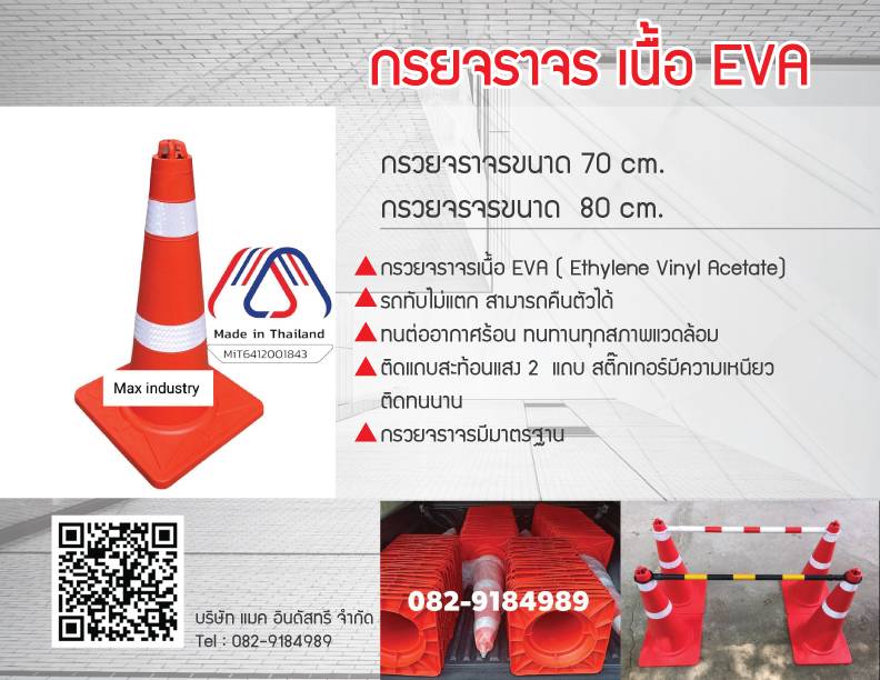 กรวยจรา เนื้อ EVA มีขนาด 70 cm. และ 80 cm. มีมาตราฐาน ทนแดด ทนฝน สามารถติดโลโก้บริษัทได้